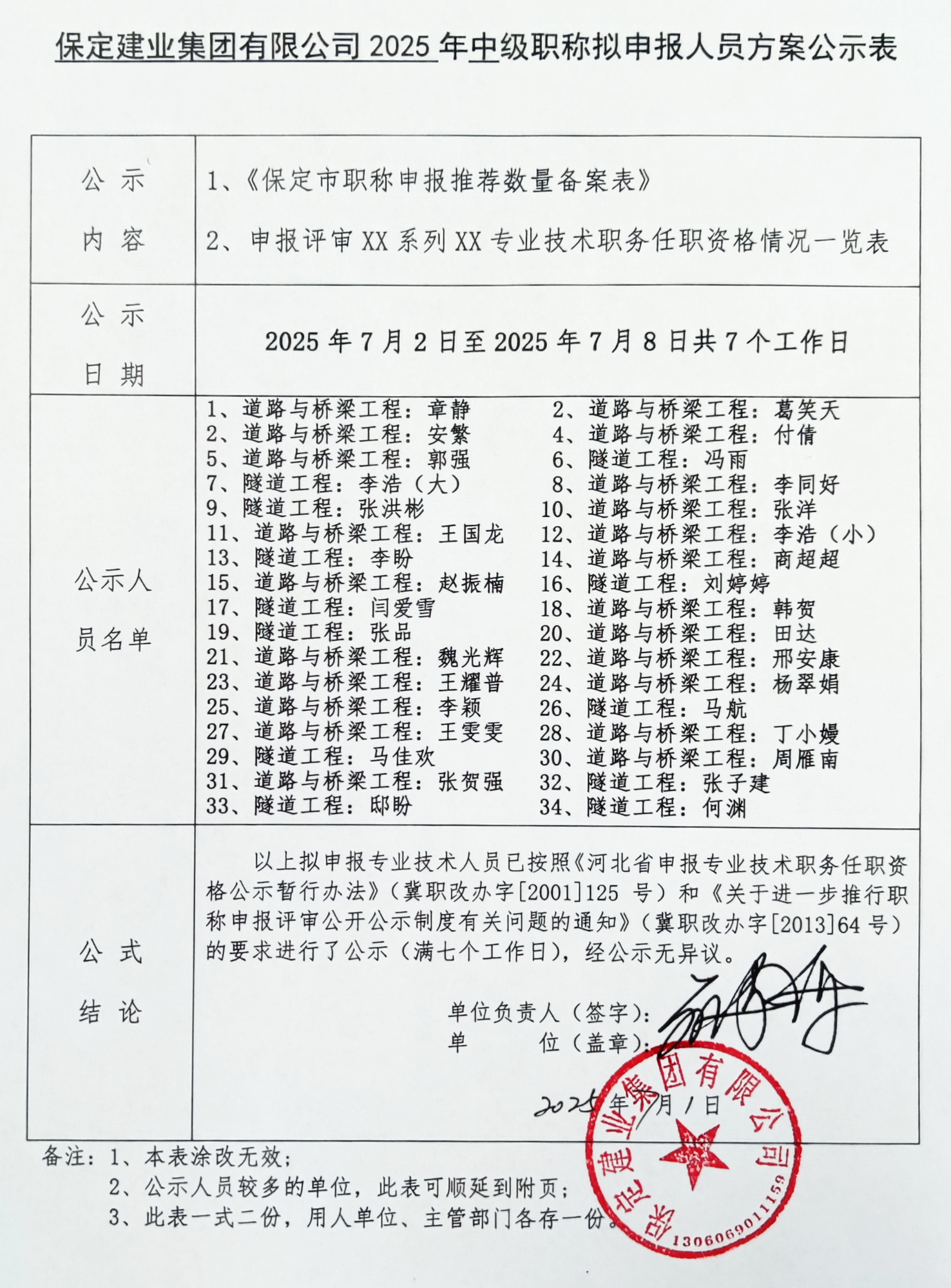 保定建业集团2025年中级职称拟申报人员公示二